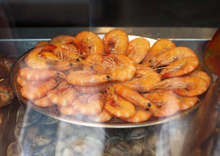 Feresh tiger prawn shrimp sell in fishery market close up seafood