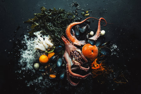 A fresh assortment of seafood, including octopus, shrimp, mussels, and crabs, elegantly arranged on a black concrete background with ice pieces for a sophisticated, luxurious presentation