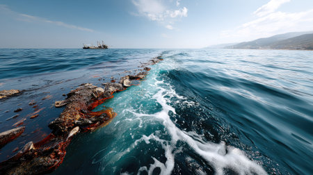 Medium frame capturing open ocean waves with floating debris emphasizing the urgent need for pollution control to safeguard marine habitats.