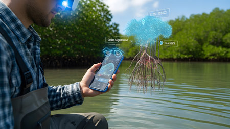 A man in waders uses a smartphone and VR headset to view a holographic mangrove tree with data...