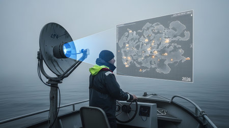 Person on boat uses tablet showing AI analysis of underwater fish school data. Clear details and ...