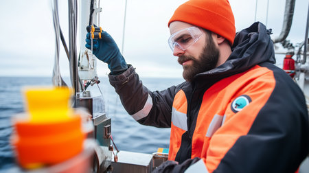 Seaman onboard a ship fills checklist. Paperwork at sea,