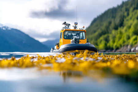researchers meticulously obtain water samples under calm aquatic farms using drone surveillance technology