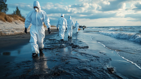A group of workers in white protective suits walks along the shoreline, cleaning up an oil spill. Waves crash against the rocky beach as they carefully remove contaminated debris in a foggy atmosphere.