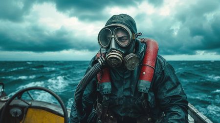 A mysterious figure wearing a gas mask and a life vest sits in a boat on a rough, stormy sea, symbolizing post-apocalyptic survival, pollution, and environmental disaster.