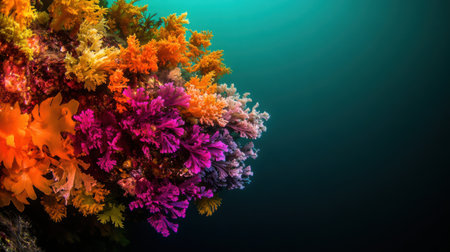 Beneath the ocean surface, colorful corals thrive, showing vibrant hues of orange, purple, and blue. Their delicate forms create a stunning contrast with the surrounding marine life.