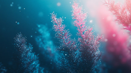 Abstract image featuring pink and blue flora-like structures adorned with sparkling particles against a dark, gradient background, creating an ethereal and dreamy atmosphere.