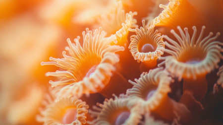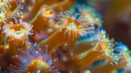 A macro of vibrant coral polyps opening like flowers on ocean floor, glowing orange under water light