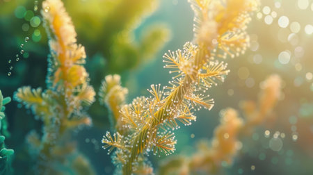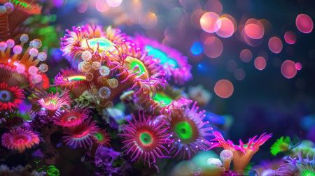 Explore a stunning underwater scene showcasing a vibrant coral reef adorned with colorful sea anemones. This close-up captures the unique beauty of marine life enhanced by a shimmering bokeh effect, creating an enchanting atmosphere.