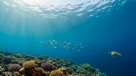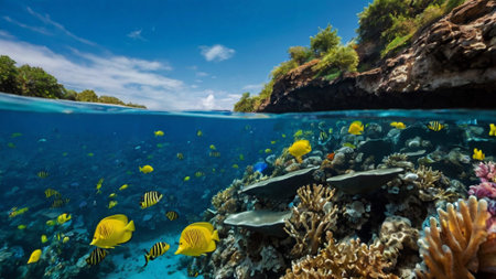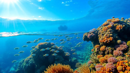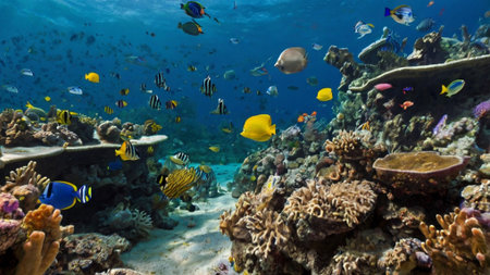 Stunning underwater scene of a vibrant coral reef teeming with life. Peaceful ocean depths