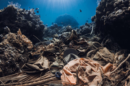 Tranquil underwater scene with pollution and corals. Tropical sea with transparent blue water
