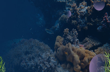 underwater coral reef landscape background in the deep blue sea with colorful fish and marine life