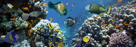 Underwater ocean life with corals and tropical fish. Underwater sea nature in ocean