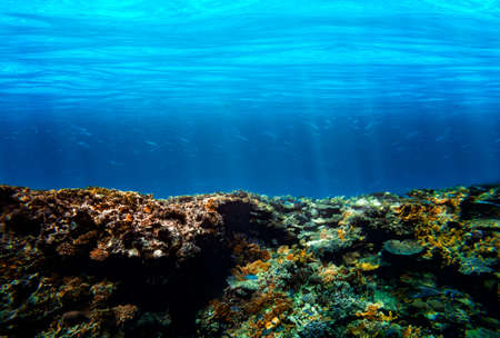 Underwater coral reef landscape background in the deep blue sea with colorful fish and marine life