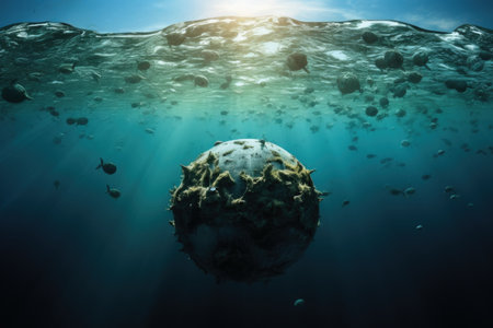 Underwater view of ocean pollution. Plastic bottles and debris.