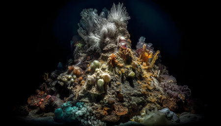 Vibrant coral reef scene, showcasing diverse marine life in a dark underwater setting.