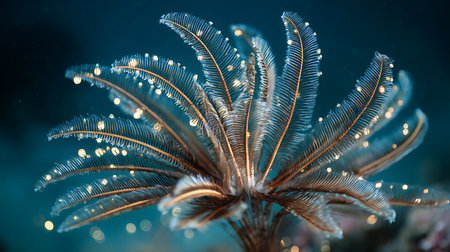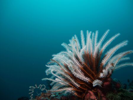Sea Lily (feather Star) on top of the coral. She spread her feathers against the blue water. Underwater photography, Philippines.