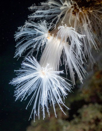 Close-up of white plumose sea anemones in an aquarium, illuminated by artificial lighting, showcasing their delicate, flowing tentacles.
