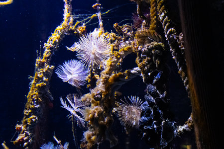 Beautiful sea anemones growing in the aquarium in Germany. Underwater scenery.