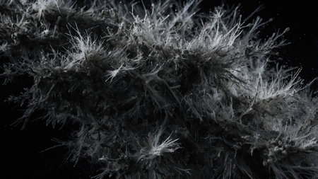 This image displays abstract white feather-like structures against a dark background, highlighting the intricate details and delicate, ethereal appearance, reminiscent of organic or crystalline formations in nature.