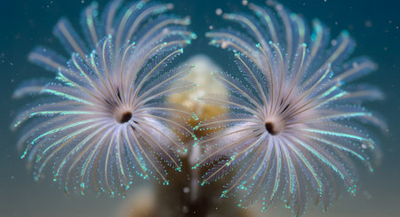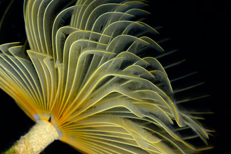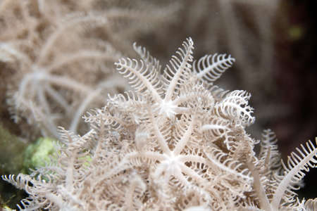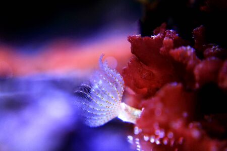 White tiny tube worm in macro scene in marine reef aquarium
