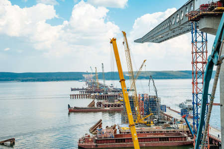 Construction of a bridge over the Volga River. Construction of bridge piers.