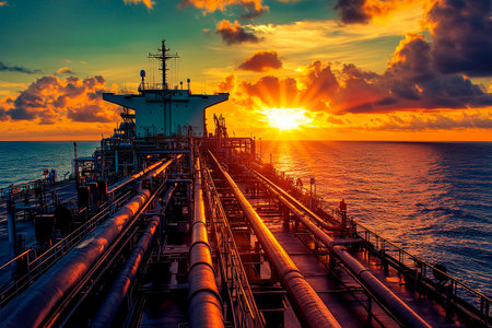 A large tanker is docked at an industrial port, surrounded by pipelines and machinery. The clear blue sky complements the vibrant water, creating a busy yet serene atmosphere.