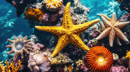 This captivating underwater image showcases a vibrant array of colorful sea stars, coral formations, and marine life, illustrating the beauty of ocean ecosystems.