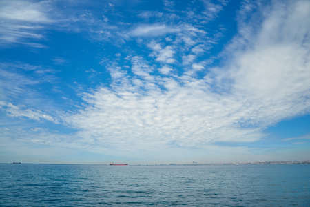 Cargo ship on a calm sea with cloudy skies over the ocean on the coast of Ponta Delgada, Sao Miguel Island, Azores, Portugal