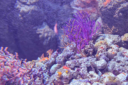Reef tank, marine aquarium. Blue aquarium full of plants. Tank filled with water for keeping live underwater animals.