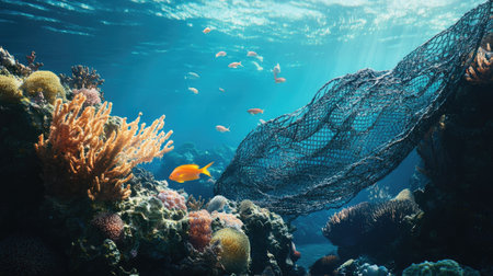 A vibrant coral reef surrounded by sustainable fishing nets demonstrating the importance of conservation efforts