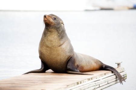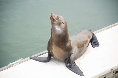 Sea lion posing in sun on pier in river off northwest coast of the Pacific ocean