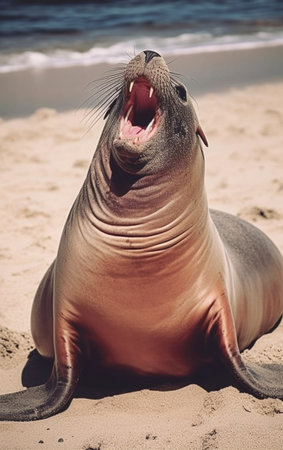 Sea lion yawning on the beach