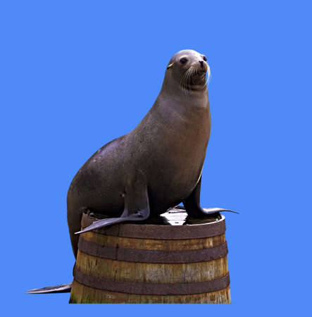 A seal ion on half a barrel isolated on blue.
