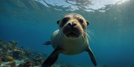 AI Generated. Funny sea lion swimming underwater in the ocean Animal theme