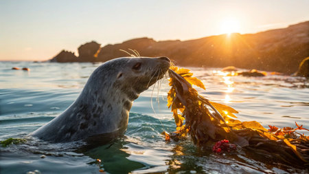 seal eating seaweed in the sea at sunset. California, USA