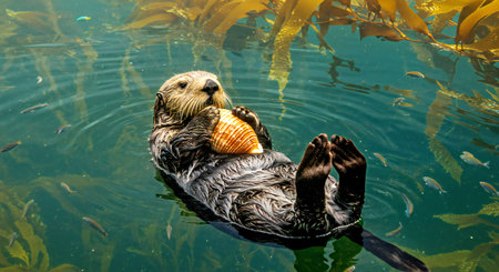 sea otter swimming in the sea with a shell in his mouth