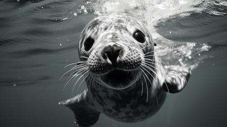 a seal swimming underwater is captured in this black-and-white graphic style photo. the close-up shot highlights the sterling silver highlights on the seal's body. with a strong facial expression, the seal looks both cute and dreamy. this captivating image was rendered in unreal engine and can be found on flickr. ai generated