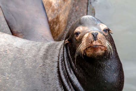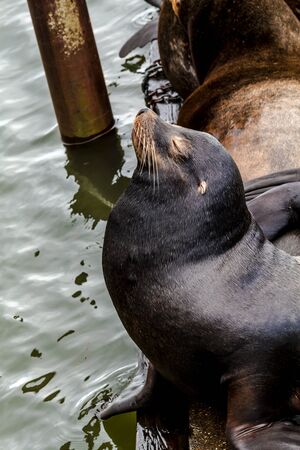 Close up of sea lion posing in sun on pier in river off northwest coast of the Pacific ocean