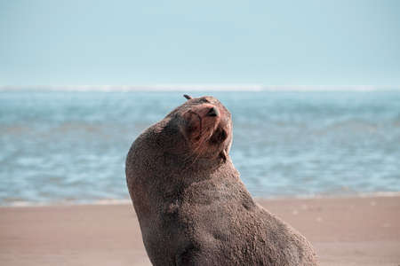 Lonely brown fur seal sits on the ocean on a sunny morning