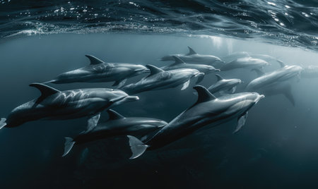 A group of dolphins are captured mid-jump, emerging from the water. The image showcases the sleek bodies and aquatic environment. The scene is illuminated by soft light, complemented by a muted color palette. The composition suggests potential use for marine life documentation and nature-themed publications.