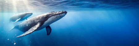 Sunlight streaming through the surface of a deep blue ocean, illuminating a mother whale and her calf as they swim gracefully in the clear, tranquil waters