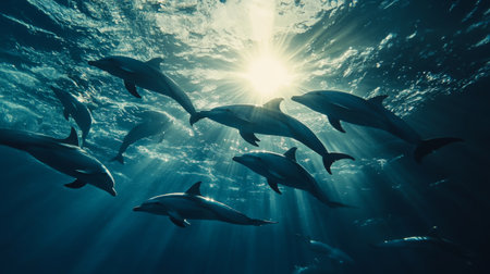 A wide shot of dolphins swimming together near the surface, with the sunlight filtering through the water and creating a serene and joyful scene.