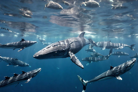 A pod of humpback whales gracefully swimming through the deep blue sea, showcasing their immense size and power.