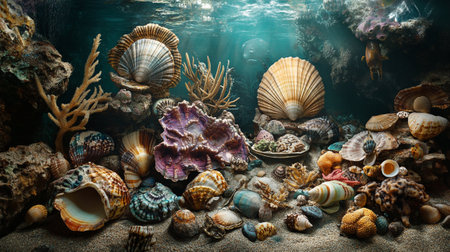 Ocean panorama with sea shells, shot from above on a vibrant blue background
