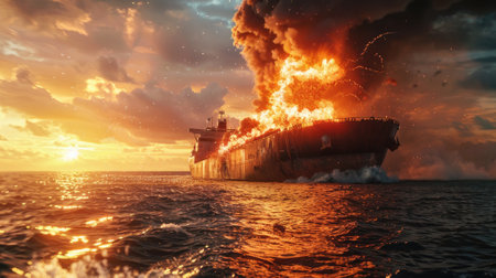 maritime emergency with a cargo ship explosion, showcasing the intense fire and smoke. Emphasize the risks and challenges in shipping logistics.