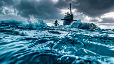 A submarine, breaking through the surface of the ocean, creates a dramatic display of spray and bubbles as it emerges from the depths.