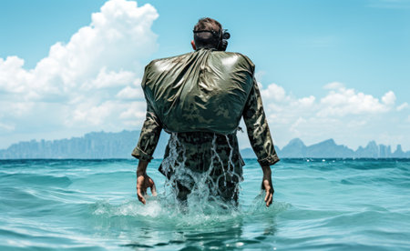Rear view of man in green raincoat standing in sea water