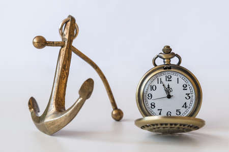 vintage golden pocket watch on island rock, blurred sea as background
