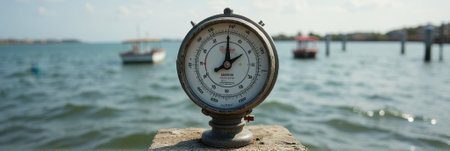 Vintage marine pressure gauge by water with boats in background on overcast day. That the image is generated using AI.